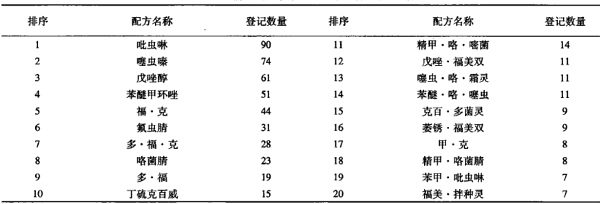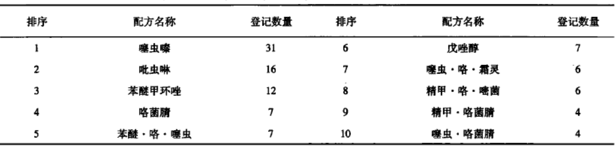 种子处理产品的行列,产品结构有了一定程度的优化;共有登记配方50个(包括12种单剂产品),前10位的配方及其具体登记数量(表4),混配产品所占比重明显增加;此外,毒性级别较高的