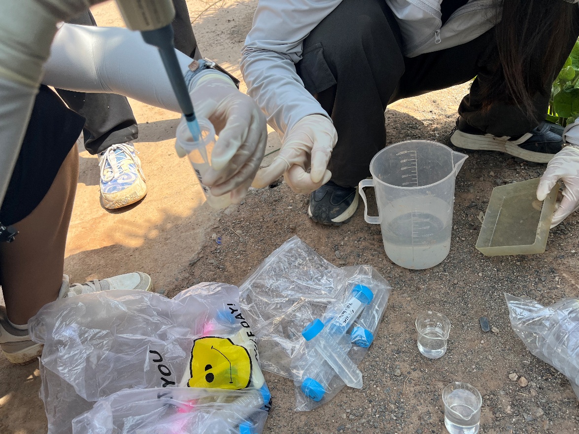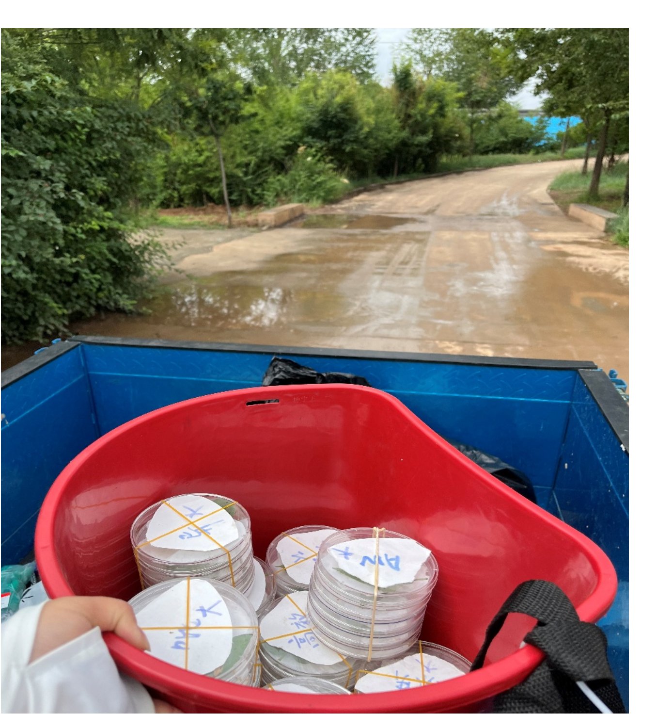 除此之外,团队成员还在番茄棚里进行了农药的生物测定,大家在户外利用移液枪、烧杯等工具,规范操作进行试剂配比与样本处理,模拟实际防治场景,严谨记录农药作用效果。并且完成生物测定后,将处理好的样本(培养皿中的叶片及标记样本 )有序收纳,做好分类标记,便于后续数据统计分析。最后,团队身着实验服,携带施药设备前往田间,按方案完成农药喷施。施药结束,全体成员在田间合影,记录实践成果。