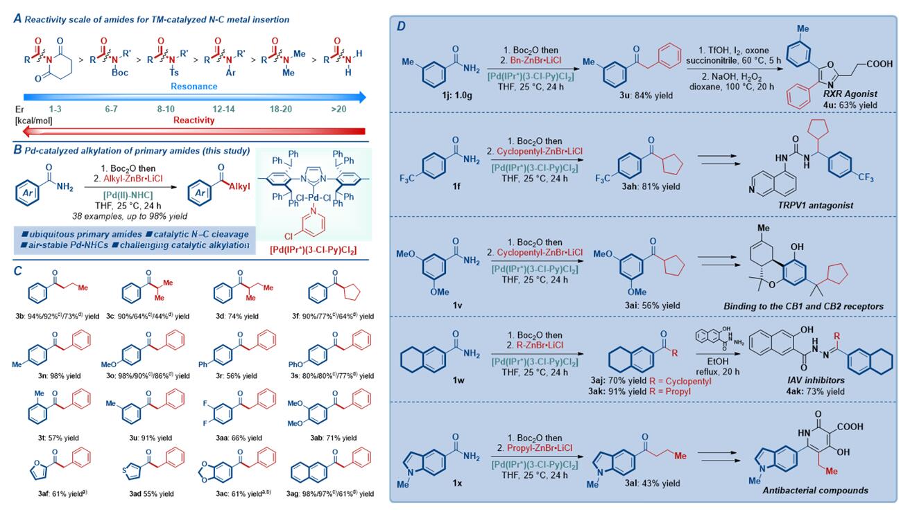 作为酰胺家族中最基础、应用最广泛的衍生物,伯酰胺的研究却长期面临瓶颈:受伯酰胺键平面性质影响,通过金属插入实现酰基键活化,一直是化学合成领域的重大挑战(图1 A)。此前,仅有一篇研究报道通过镍催化结合有机锌试剂,实现了仲酰胺的烷基化,但该方法无法适用于伯酰胺,极大限制了酰胺类活性分子的研发范围。